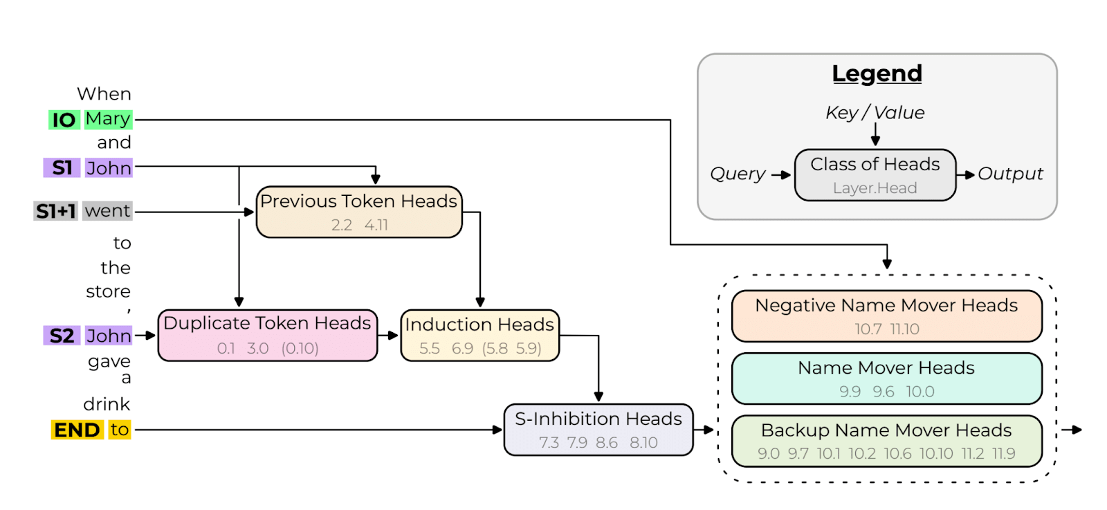 In the indirect-object-identification (IOI) task, the model is prompted with sentences like “Lisa and Max went to the park and Max gave a flower to”, with “ Lisa” being the correct completion. Prior work has shown that there is a group of 4 heads in layers 7 and 8, the S-Inhibition heads, which compute information about both the position of the repeated name (first in the sentence, as in “Max and Lisa… Max gave…” vs second in the sentence, as in “Lisa and Max… Max gave…”) and the identity of the repeated name in the sentence. After that, another class of heads (the name mover heads) in layers 9, 10 and 11 use this as a signal to attend to the name that only appears once in the sentence, so that they can copy it to the final output.