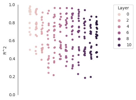 We repeat this experiment with different random vectors and for each layer in gpt2-small. We observe that all regressions are better than chance and explain a significant amount of variance on the held-out test set (R^2 = 0.71 +/- 0.17, MSE = 0.31+/- 0.18, p < 0.005).