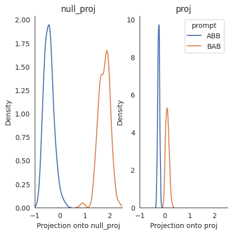 Next, we show that the nullspace component is much more correlated with the position information than the remaining component . We sample a set of prompts which are of the form ABB or ABA, take their MLP8 activations and project those onto and :