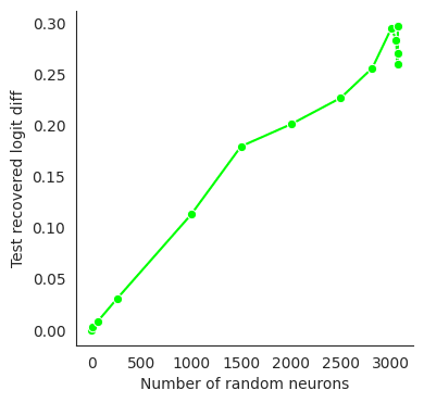 We observe a linear relationship between the number of neurons used for training and performance of DAS (y axis measures the fraction of logit difference lost compared to patching the entire residual stream after layer 8 at the END token):