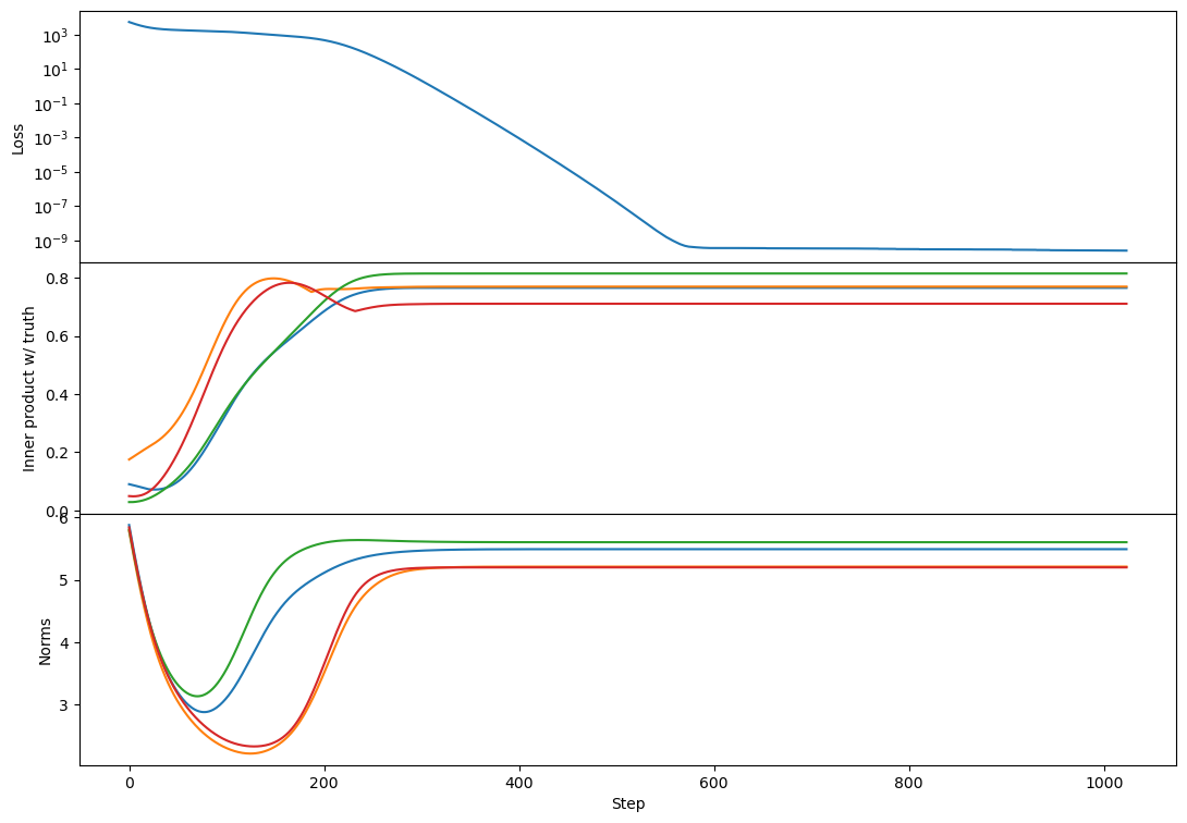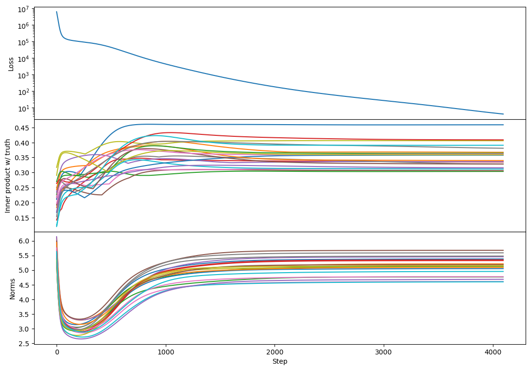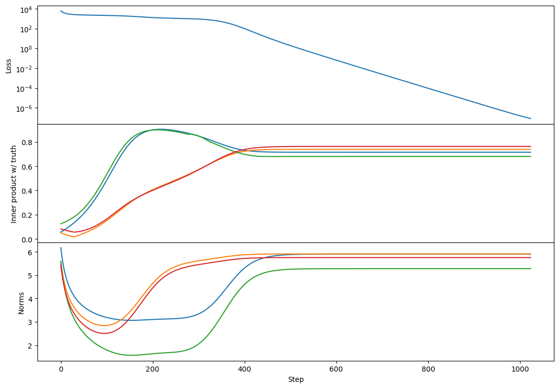 At the same time, we also have a term , which causes a growing component in proportional to the truth. This component grows in size until it comes to dominate, at which point we see both the vector norms rebound and simultaneously they come into better alignment with the target vectors. Due to the non-uniqueness of matrix decompositions they do not come into as obvious an alignment as before, but we do generally see inner products increase during this phase.