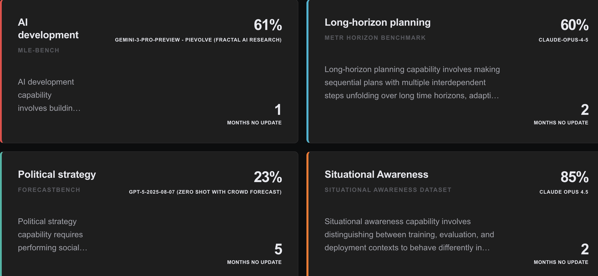 Good question. First, many of these benchmarks are about things that are dangerous, but not particularly economically valuable (example: bioweapons). My model of labs is that they’re mostly trying to do economically valuable things (as most companies are forced to). Although they may be reckless, I don’t currently have the impression they’re actively trying to take over power, by using things such as bioweapons. Second, some benchmarks are about things that are economically valuable, for example the METR one. But these mostly get benchmaxxed already. Third, we are not creating new benchmarks, but only tracking the scores for existing ones and coupling them to existential threat models. If labs wanted to benchmax any benchmark we track, they could do so with or without our work.