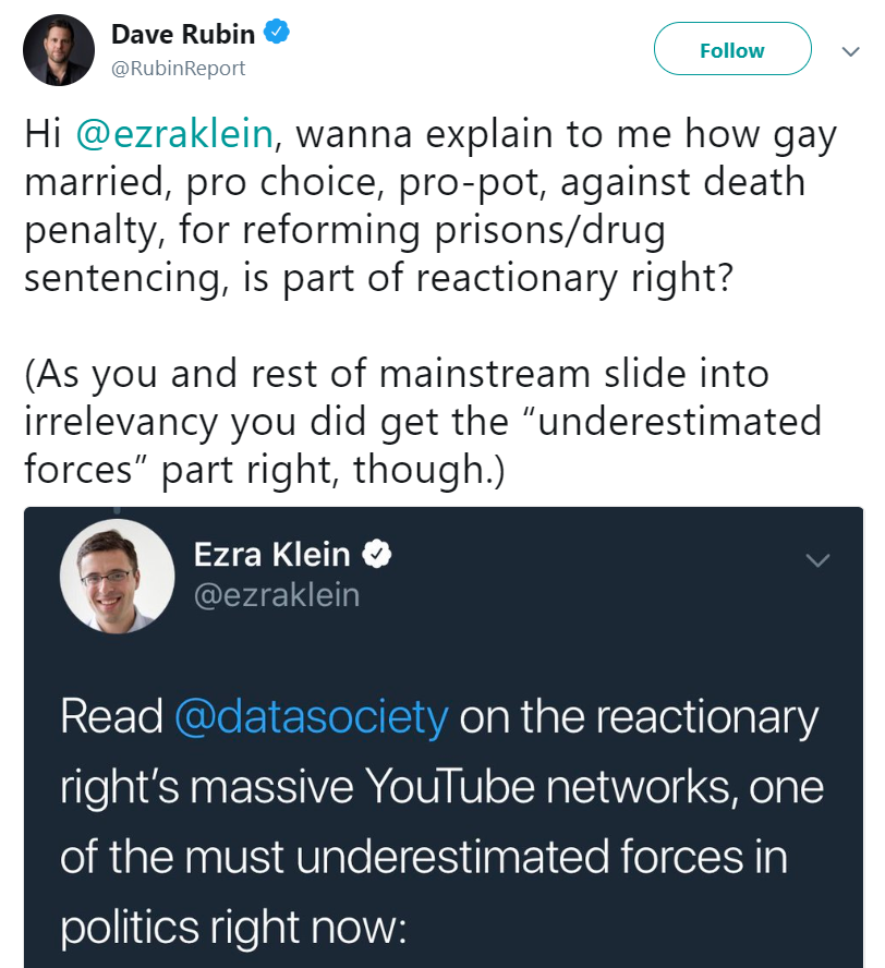 Klein’s article responds to a challenge by Dave Rubin, wondering how he (Rubin) suddenly became a conservative reactionary: