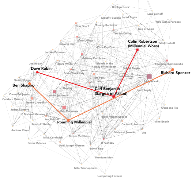 Another way to identify this group is via a network graph, a network whose nodes are people Ezra Klein is suspicious of and whose edges are podcast appearances and YouTube interviews. Lucky for Klein, Rebecca Lewis of the Data & Society research institute created a chart of this network using an algorithm, and we all know that algorithms are objective and trustworthy.