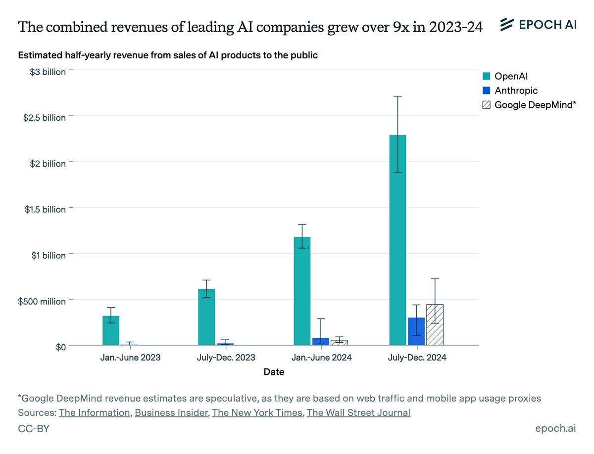 Epoch AI: We estimated OpenAI and Anthropic revenues using revenue data compiled from media reports, and used web traffic and app usage data as proxies for Google DeepMind revenues. We focus on these three because they appear to be the revenue leaders among foundation model developers.