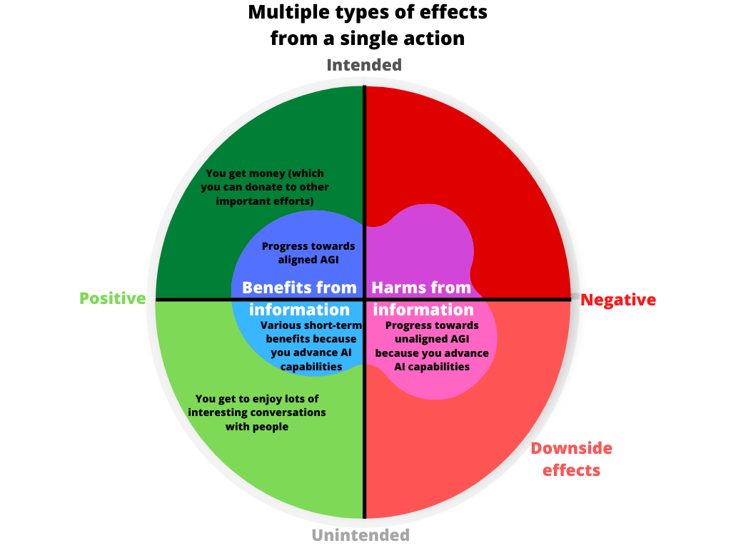 Your rationale for taking this action might be that you could make progress towards safe, aligned AGI (which has various benefits, including reducing risks from unsafe, unaligned AGI), and that you could make a good salary, allowing you to donate more to efforts to mitigate other risks (e.g., work on alternative foods or on reducing biorisks). These are the intended effects of the action. Both are positive, and the first occurs via the sharing of (true) information.