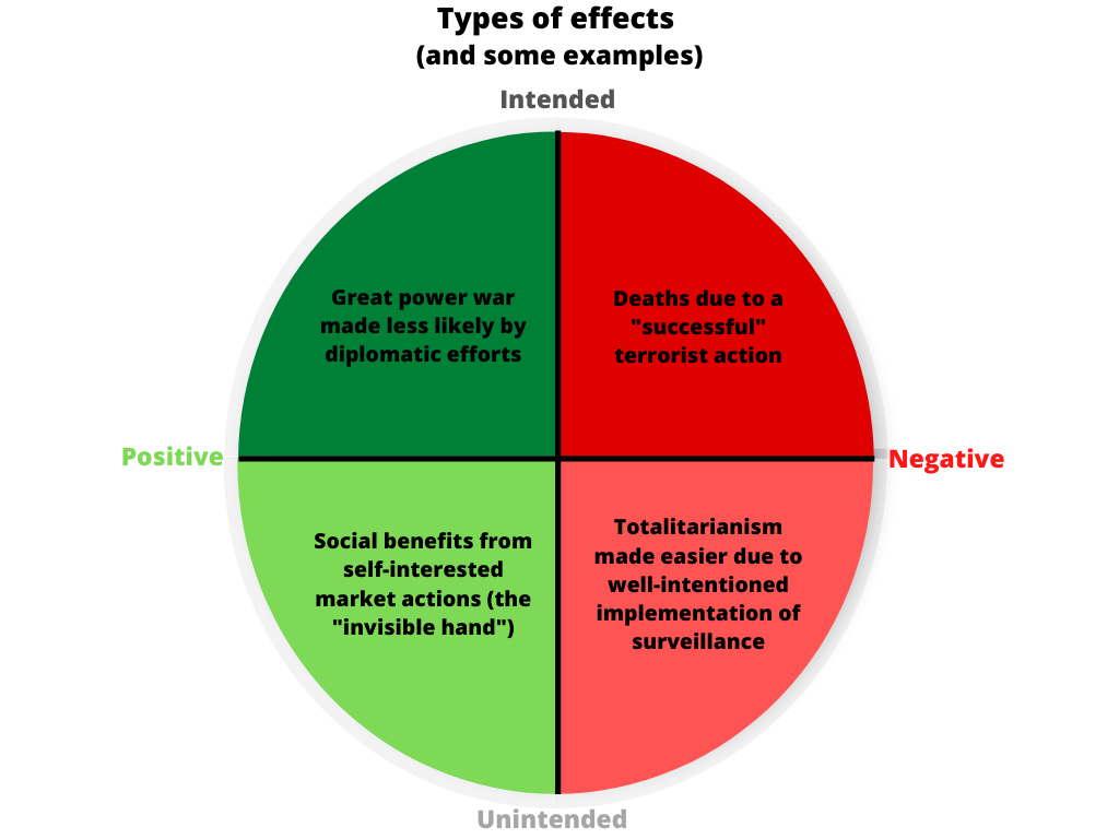 The area of each component of this “space” is not meant to signify anything about the relative commonness or likelihood of each type of effect. For example, I would suspect unintended negative effects are much more common than intended negative effects, but I have kept each quadrant the same size regardless.