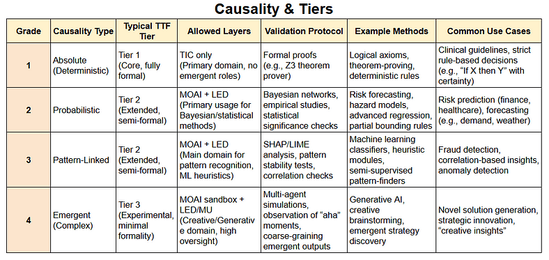 In CCACS, every type of reasoning — from absolute, deterministic logic to emergent, exploratory insights — requires matching formalization and validation protocols. The tables below illustrate how causality grades align with Thinking Tool tiers, ensuring that tasks needing high certainty remain fully transparent, while more exploratory tasks can still be systematically managed.