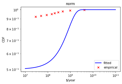 I attempted to fit various probability distributions to these data by assuming my empirical data set matched the top 10% of YCombinator companies and then matching the cumulative distribution function to my results. I was able to fit several distributions reasonably well, but their parameter values were implausible, and I think this is just an example of how you can fit any data if you give yourself enough parameters. (Although you can see that the normal distribution does not at all fit the data, indicating that this isn’t complete over fitting.)