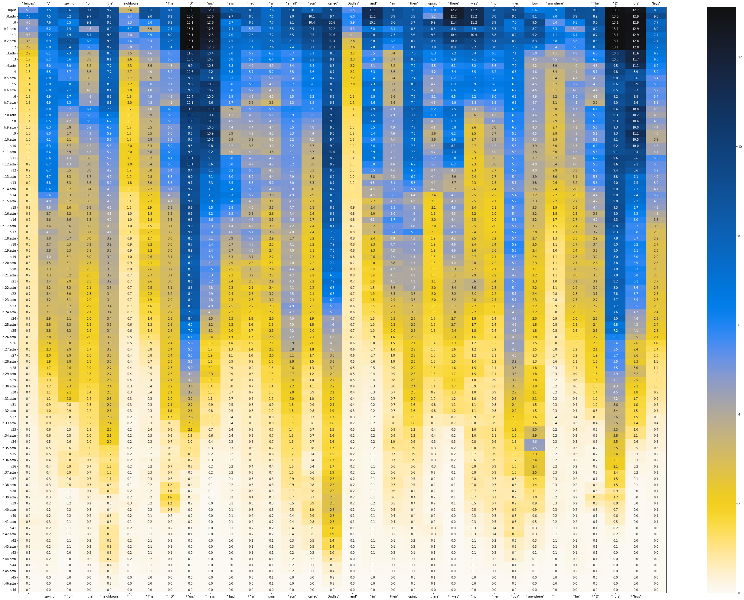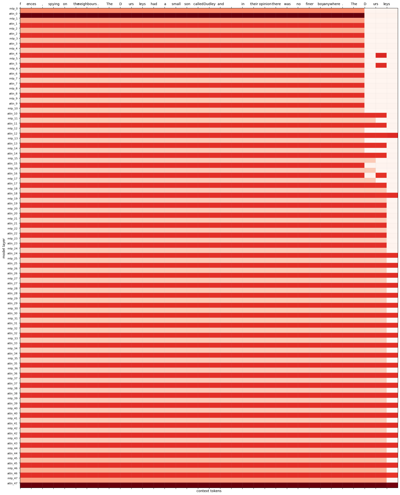 The one change made to nostalgebraist’s code is to change the orientation. Instead of going bottom-to-top for layers, it now goes top-to-bottom for layers. I also changed the orientation from the ROME project to go top-to-bottom for layers and left-to-right (instead of top-to-bottom) for tokens. Seems like everyone has their own take on the best way to orient such visualizations, but I prefer my orientation so it’s worth it to me to convert other’s visualizations to my preferred orientation.