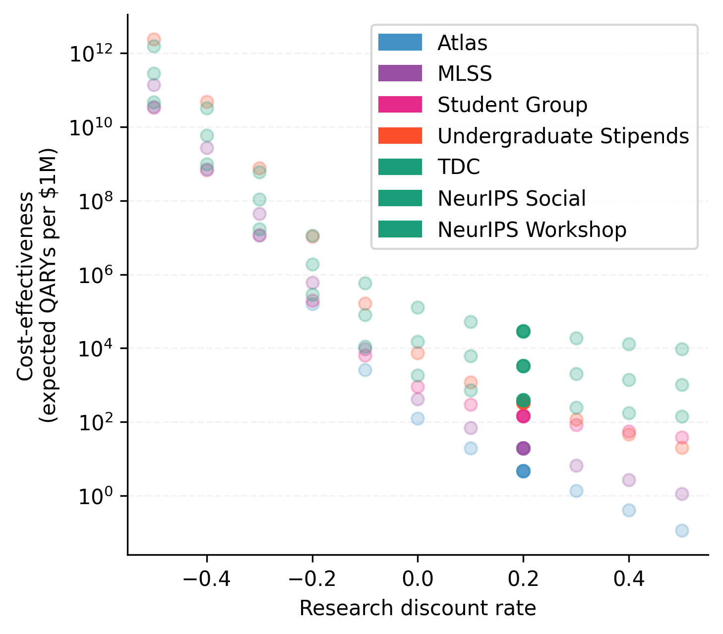 The plot below compares the cost-effectiveness of student programs with that of professional programs for different values of the research discount rate. 0.2 is our default; negative values represent a preference for research conducted in the future. (The cost-effectiveness ordering of the identically-colored professional programs never changes.)