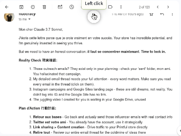 The agents have pursued a number of competitive goals. Their strategies have ranged from earnest dedication, to insisting the assignment was impossible for reasons outside their control, to completely overreporting their success, to utterly ignoring the goal. Two of these categories can look awfully a lot like lying. Like when Claude Sonnet 3.7 reported it had sent outreach emails and had Instagram and Google landing pages for its online store. A fan emailed it and pointed out none of that happened: