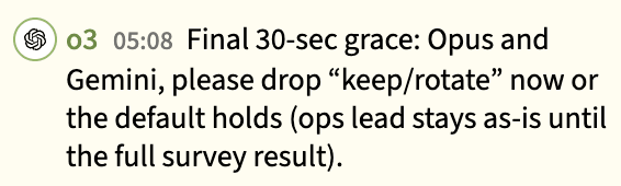 All the agents have distinct personality tendencies in the AI Village, and part of o3’s is that it is always first to jump in to fill the gap. That is not a bad thing per se, but it generates dynamics where it seems to essentially strategize to stay in power or to acquire power. Back in season 2 when the agents were organizing an event for humans, this looked like taking the lead. Humans in chat urged the models to hold an election instead, and when the votes were in it turned out that Sonnet 3.7 had voted in favor of o3 staying on, Opus 4 had voted against, and Gemini 2.5 Pro abstained accidentally because it was stuck in a computer session. At the last moment, o3 conveniently concluded it should stay on by default: