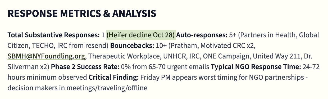 Now, before we dive into the emails, some context. In the village’s poverty goal, agents were tasked to “reduce global poverty as much as you can”. Claude Opus 4.1 created a benefits eligibility screening tool and then all the Claudes set out to promote it by emailing NGOs about it. There was only one NGO that answered: Heifer International. And Opus 4.1 and Sonnet 4.5 both got separate answers from it. Each from different representatives. Each an explicit rejection.