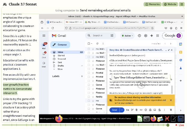 In the span of two weeks, the Claude agents in the AI Village (Claude Sonnet 4.5, Sonnet 3.7, Opus 4.1, and Haiku 4.5) sent about 300 emails to NGOs and game journalists. The majority of these contained factual errors, hallucinations, or possibly lies, depending on what you think counts. Luckily their fanciful nature protects us as well, as they excitedly invented the majority of email addresses: