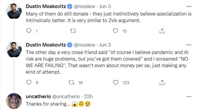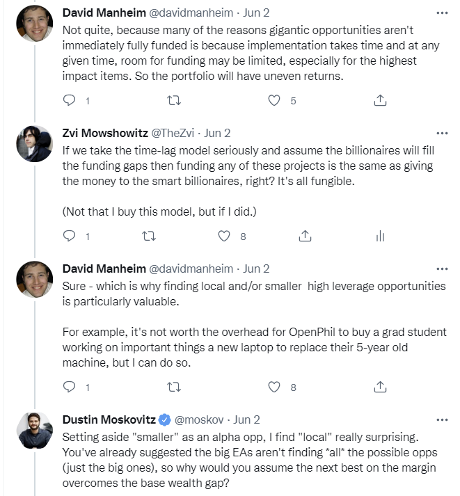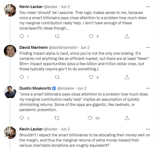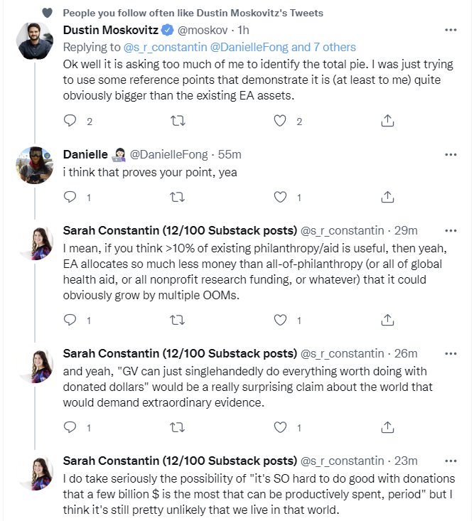 That sparked a bunch of discussion about central concepts in Effective Altruism. Those discussions ended up including Dustin Moskovitz, who showed an excellent willingness to engage and make clear how his models worked. The whole thing seems valuable enough to preserve in a form that one can navigate, hence this post.