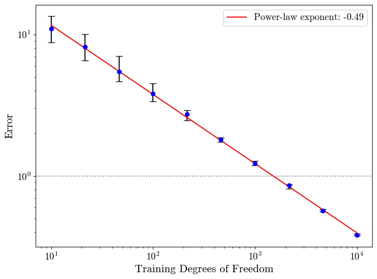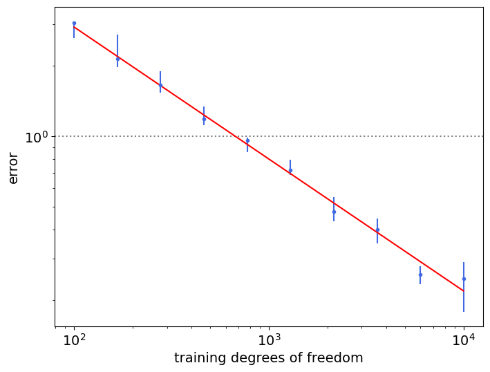 The plot below shows data scaling on on a single-cluster dataset fitted with 1-nearest neighbors (c=2), with one-dimensional regression labels obtained via a linear teacher function. Training degrees of freedom represent the number of points in our dataset.