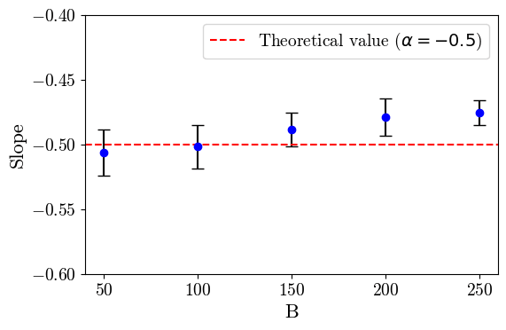 Data scaling with c=2: expected slope =−0.5, fitted slope =−0.49. Median, 16th and 84th percentiles shown for a total of 10 runs.
