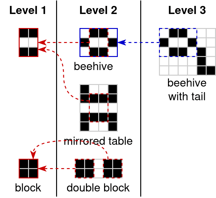 In order to construct high-level concepts which would by default be above the complexity threshold , we’ll reintroduce the concept hierarchy which we previously successfully used for the Game of Life still lifes: any generating function may call any other generating functions below it in the hierarchy. The calling function only has to pay the storage cost for the passed argument.
