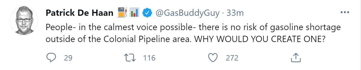 The obvious harmless explanation for all this is that perhaps the pipeline disruption was minor – the claim is that supplies will mostly be flowing again by the end of the week – and it didn’t cause much supply disruption, and all we’re dealing with is a few areas where people started hoarding gas and things will be annoying for about a week. So in some sense (the sense in which you have zero respect for the people buying gas responding to very clear incentives) this sort of is a demand-side problem and not worthy of much coverage. But also covering it more would make it happen more so it’s easy to understand the desire to downplay it a bit. I’ve similarly downplayed or ignored stories about Covid for similar reasons, for example when someone with a large audience started talking about how they didn’t ‘need’ the vaccine and encouraging people not to get it, I asked myself ‘how would talking about this help anything?’ and didn’t mention the Person Being Wrong On The Internet.