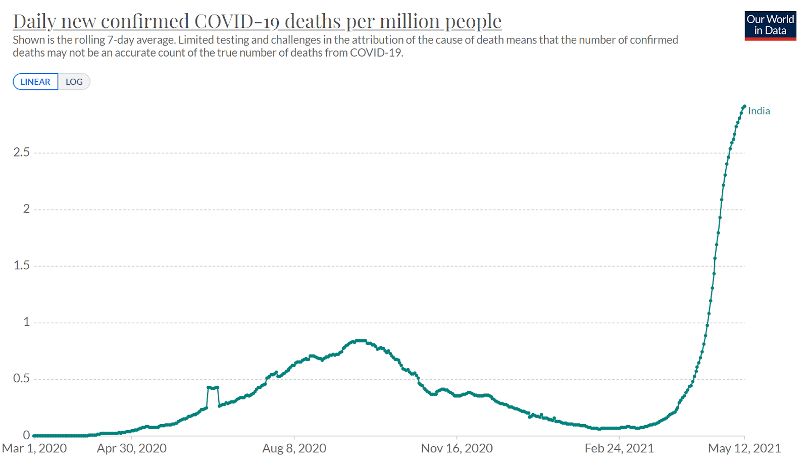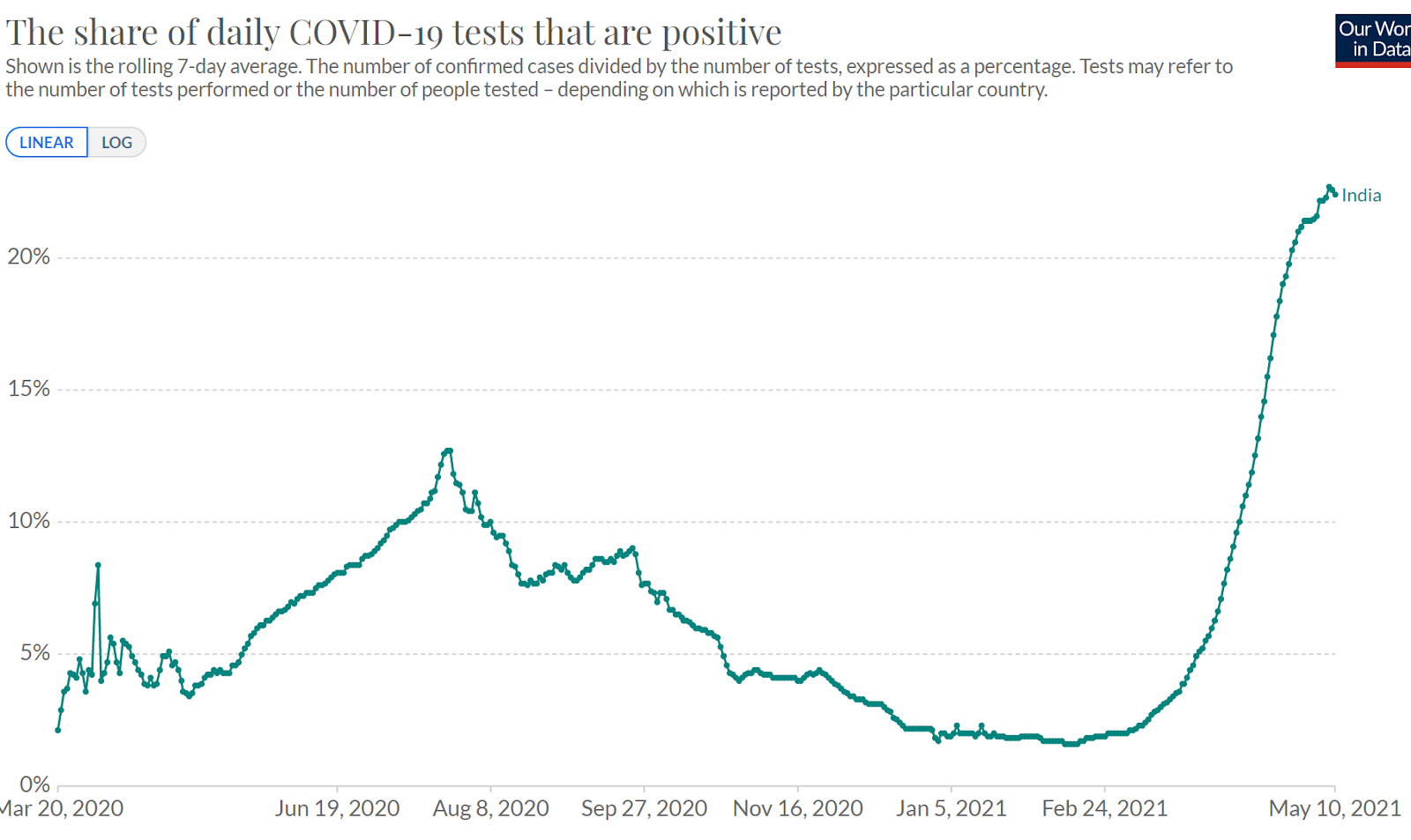 Regarding the positivity rate in India stalling out, I would be hesitant to over-interpret this. There is a natural limit to the positivity rate somewhere below 100% (it might even be roughly 25% as we’re currently seeing).
