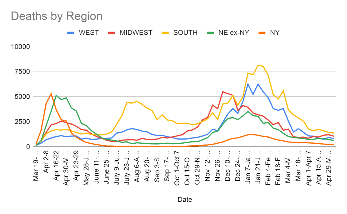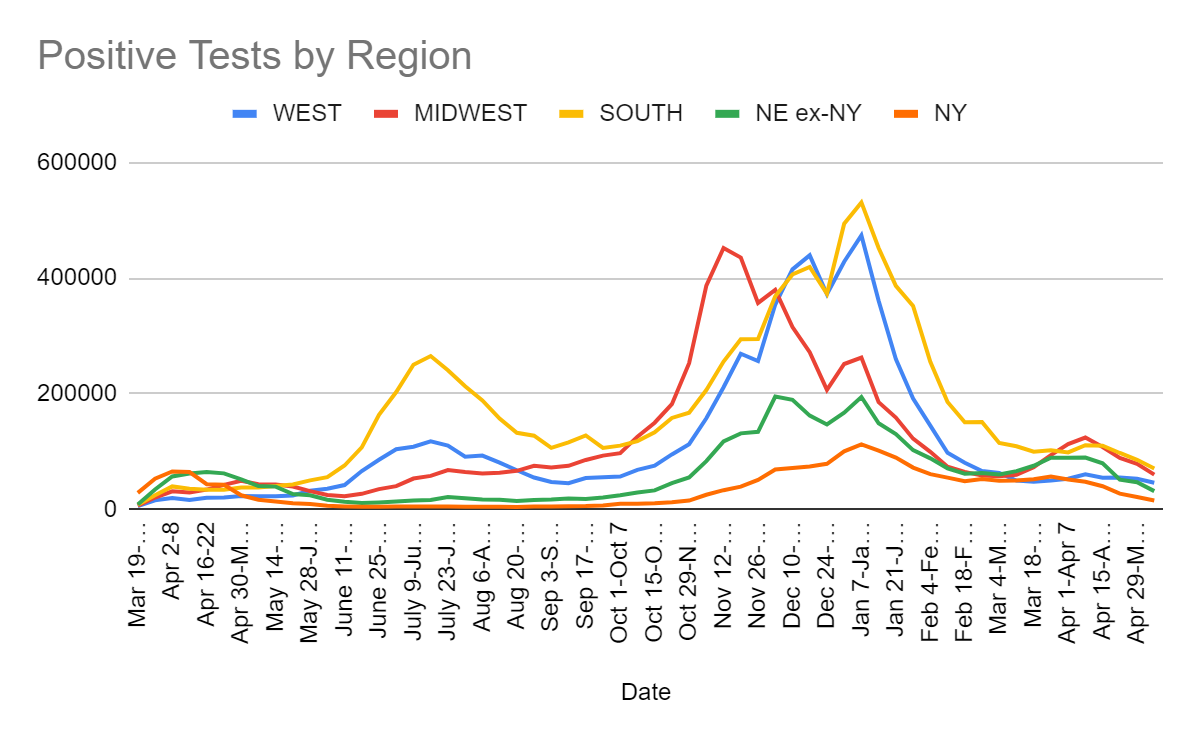 That’s a dramatic acceleration of improvement, especially in the northeast. Progress is much slower in the West, but even 10% a week adds up quickly and there’s still a lot more vaccinations to bring online. This is what the endgame looks like.