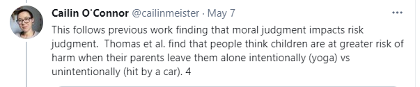 People think that being virtuous reduces COVID risk. When presented with identically risky scenarios, subjects judged risk to be higher when motives for action were bad.