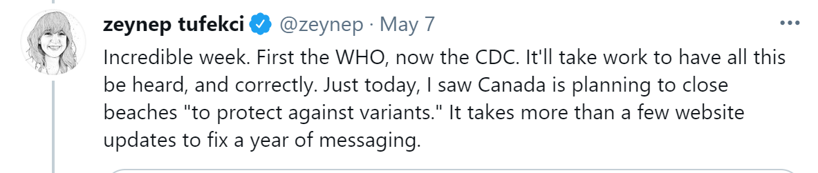 The test of whether my failure to notice this was correct is whether this change does anything. Congratulations, you’ve finally admitted that Covid spreads in exactly the way we’ve known for a year that it does, what’ll you do next? Go to Disney World and hang out at the beach? Or will you change nothing? So far as I can tell, there hasn’t exactly been a rush to update the safety recommendations, let alone any sign anyone is actually changing behavior much.
