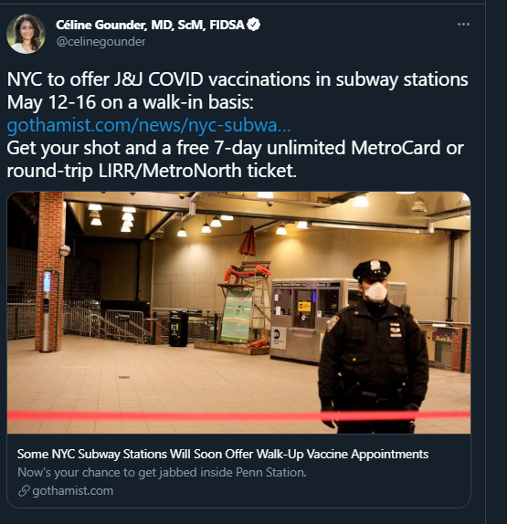 Uber and Lyft are offering, free of charge and with no government payments involved, free trips to and from vaccination appointments. Kudos to them. So if you’re claiming the logistics don’t work, there are free taxis on standby and walk-ins available. The excuses are getting rather thin.