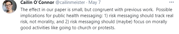 You could extend that to arguments that those you see at grocery stores or doctor’s offices are relatively low-risk, whereas the people at a beach are relatively high-risk, even if the beach itself isn’t risky, because they’re the people who are ignoring the (blatantly terrible, misleading, dishonest!) public health advice. What other rules are they breaking?