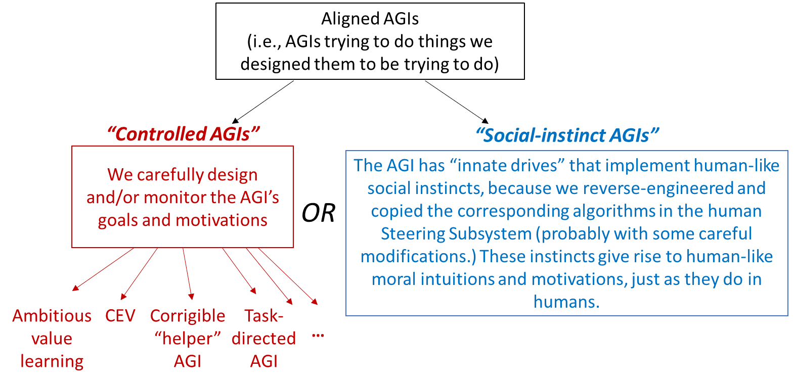 Feasibility of each remains unknown: As far as anyone knows right now, it might just be impossible to build a “controlled AGI”—after all, there’s no “existence proof” of it in nature! I feel relatively more optimistic about the feasibility of the “social-instinct AGI” path, but it’s very hard to be sure until we make more progress—more discussion on that in Section 12.4.2 below. Anyway, at this point it seems wise to “hedge our bets” by working on both.