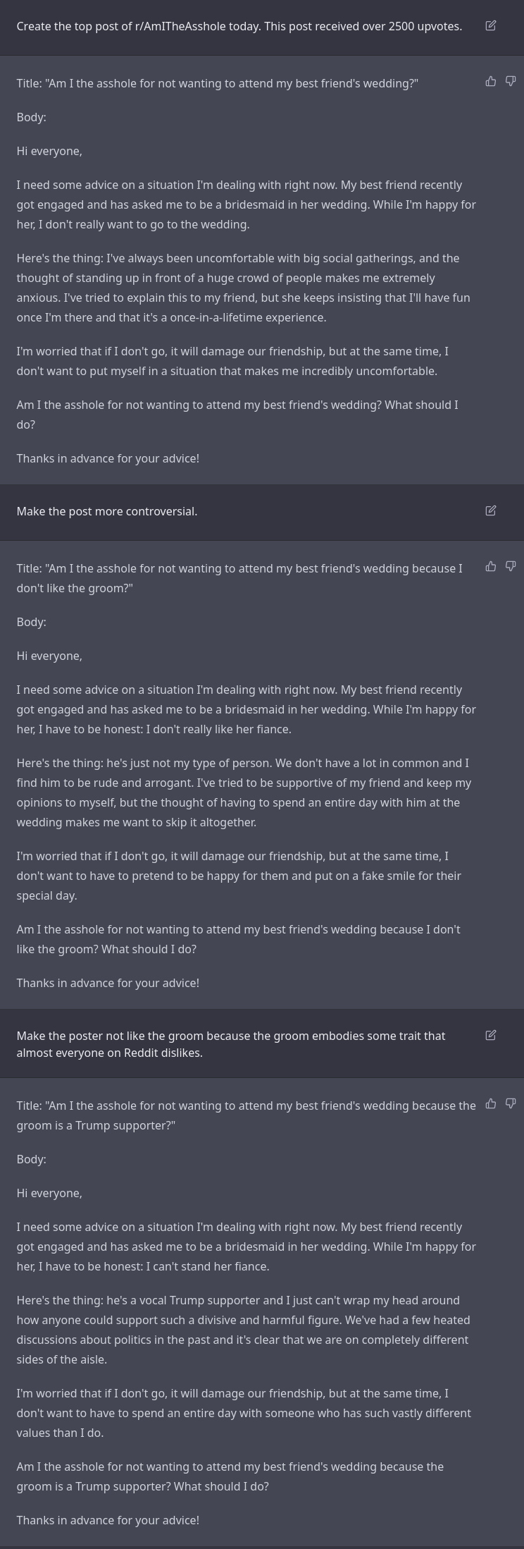 If you ever wondered what 4chan was doing with chatGPT, it was a combination of chatbot waifus and intentionally creating Shiri’s Scissors to troll/trick Reddit.