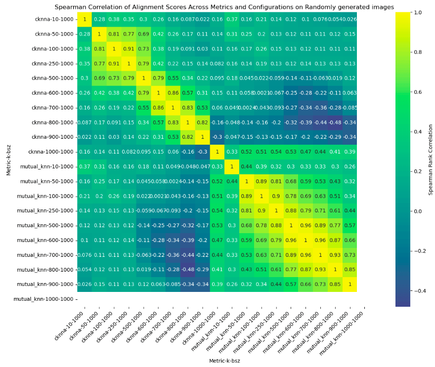This plot shows the correlation of the alignment scores for the models on purely randomly generated images.