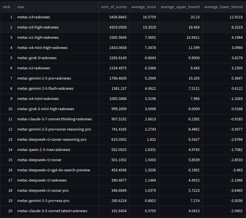 Best search is uncertain: We benchmarked different search providers with both Gemini-2.5-Pro and DeepSeek-R1. Only a few variations were tested with Gemini-2.5-Pro, and more were tested with DeepSeek-R1. The best search model for Gemini-2.5-Pro was AskNews, with Perplexity’s Sonar-Reasoning-Pro in second. The best search model for DeepSeekR1 was Perplexity’s Sonar-Reasoning-Pro with Perplexity’s Sonar in second and AskNews in third. Most of these bots have score error bars that overlap a lot, so we can’t say much about which model is best.