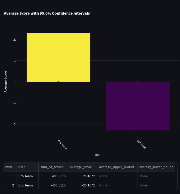 We then calculated the head-to-head scores of the two teams, along with 95% confidence intervals using a t distribution. The average bot team head-to-head score was −20.03 with a 95% confidence interval of [-28.63, −11.41] over 93 questions.