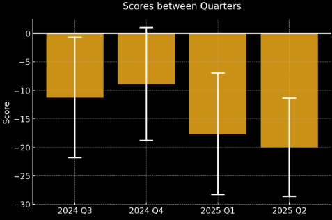 The bot team did not improve significantly in Q2 relative to the human Pro team: The bot team’s head-to-head score against Pros was −11.3 in Q3 2024 (95% CI: [-21.8, −0.7]), then −8.9 in Q4 2024 (95% CI: [-18.8, 1]), then −17.7 in Q1 2025 (95% CI: [-28.3, −7.0]), and now −20.03 [-28.63, −11.41] with no clear trend emerging. (Reminder: a lower head-to-head score indicates worse relative accuracy. A score of 0 corresponds to equal accuracy.)