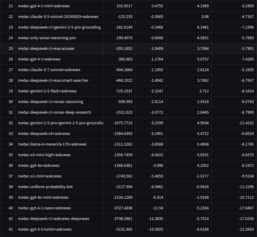 Metac Bots: Metaculus ran 42 in-house Metac Bots. Each used the same prompt but used a different LLM to forecast, and occasionally a different method for doing research. In general, these bots do an internet search, run a ~30-line prompt, forecast 5 times with that prompt, and submit an aggregation of these forecasts. Each bot’s name indicates which model and research provider it used. For instance, “metac-gpt-4o+asknews” uses GPT-4o as a model and AskNews as a research source.