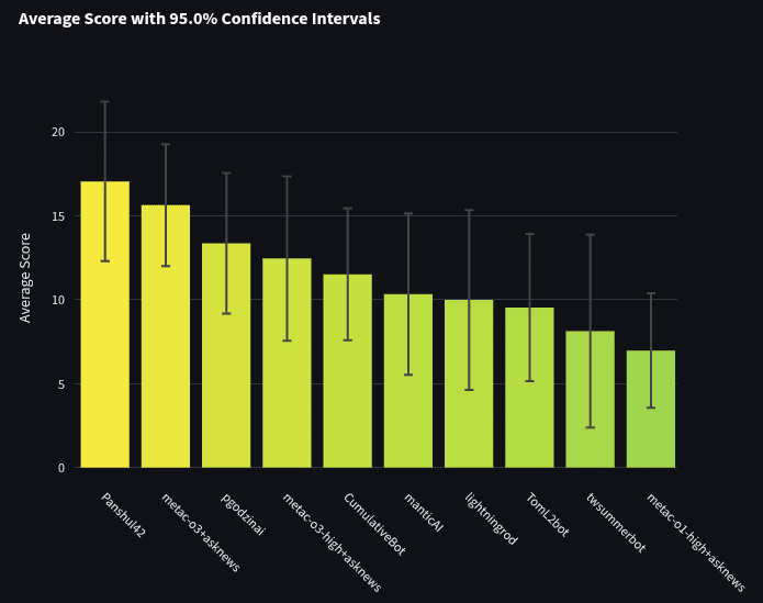 Let’s first look at our top bot. Panshul42 performed well. He did much more scaffolding than the Metaculus bots and had a sum of spot peer score of 5,899 in the tournament. He used a combination of o3 and o4-mini for his supporting roles; o3, o4-mini, Sonnet 4 for his final predictions; and a wide combination of sources for his research bots, including AskNews, Perplexity-sonar-reasoning-pro, search engines such as Google/Bing/DuckDuckGo, and static web scraping using HTML. Panshul42 beat the comparable Metaculus bot, metac-o3+asknews, which had a score of 5,131. However, it’s also notable that Panshul42 did not beat metac-o3+asknews within a 95% confidence interval, and the error bars for average spot peer score overlap considerably (see graphs in the previous section comparing top bots). So in this case, scaffolding may have an effect, but not a large enough one to be noticeable.
