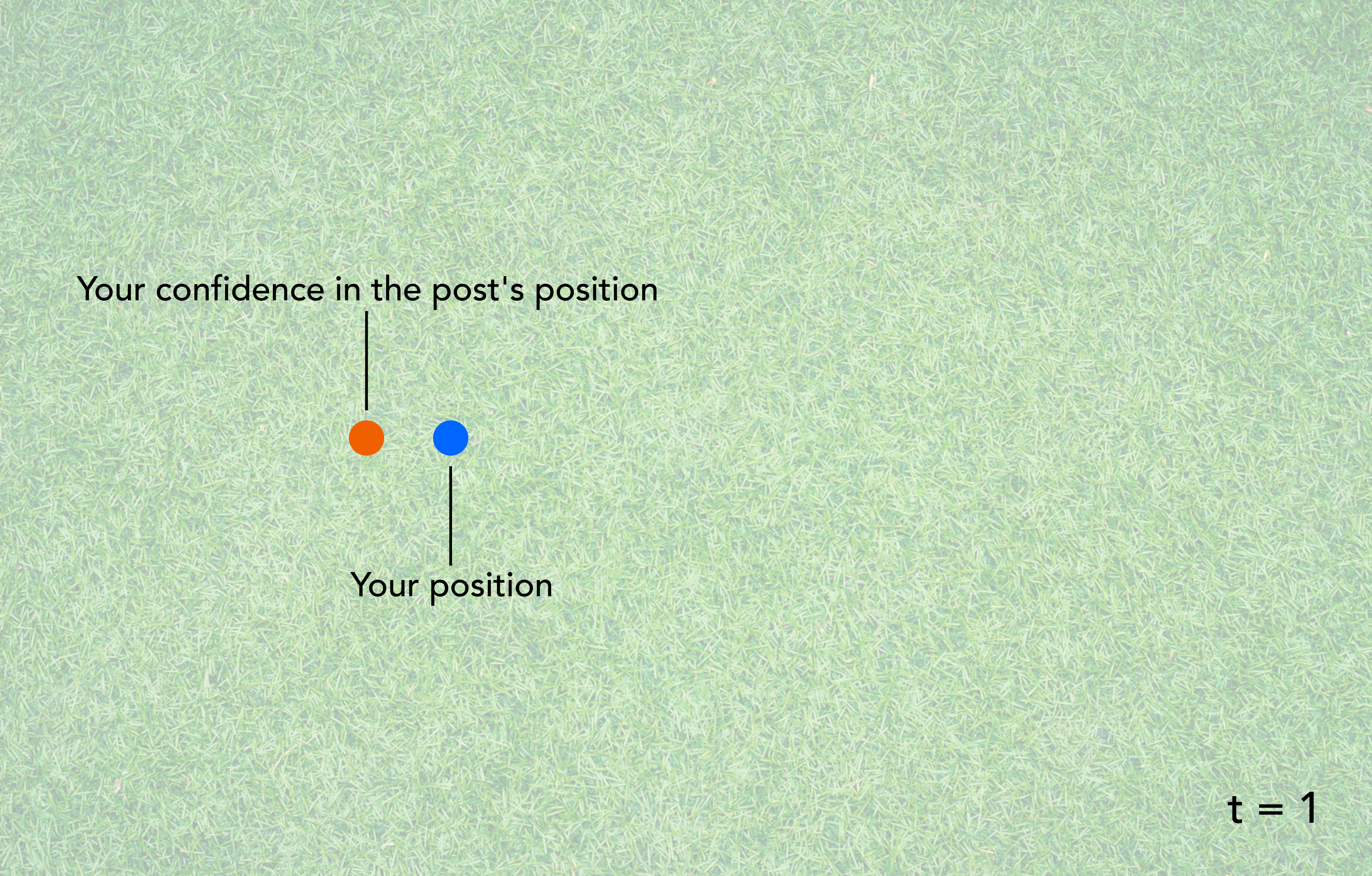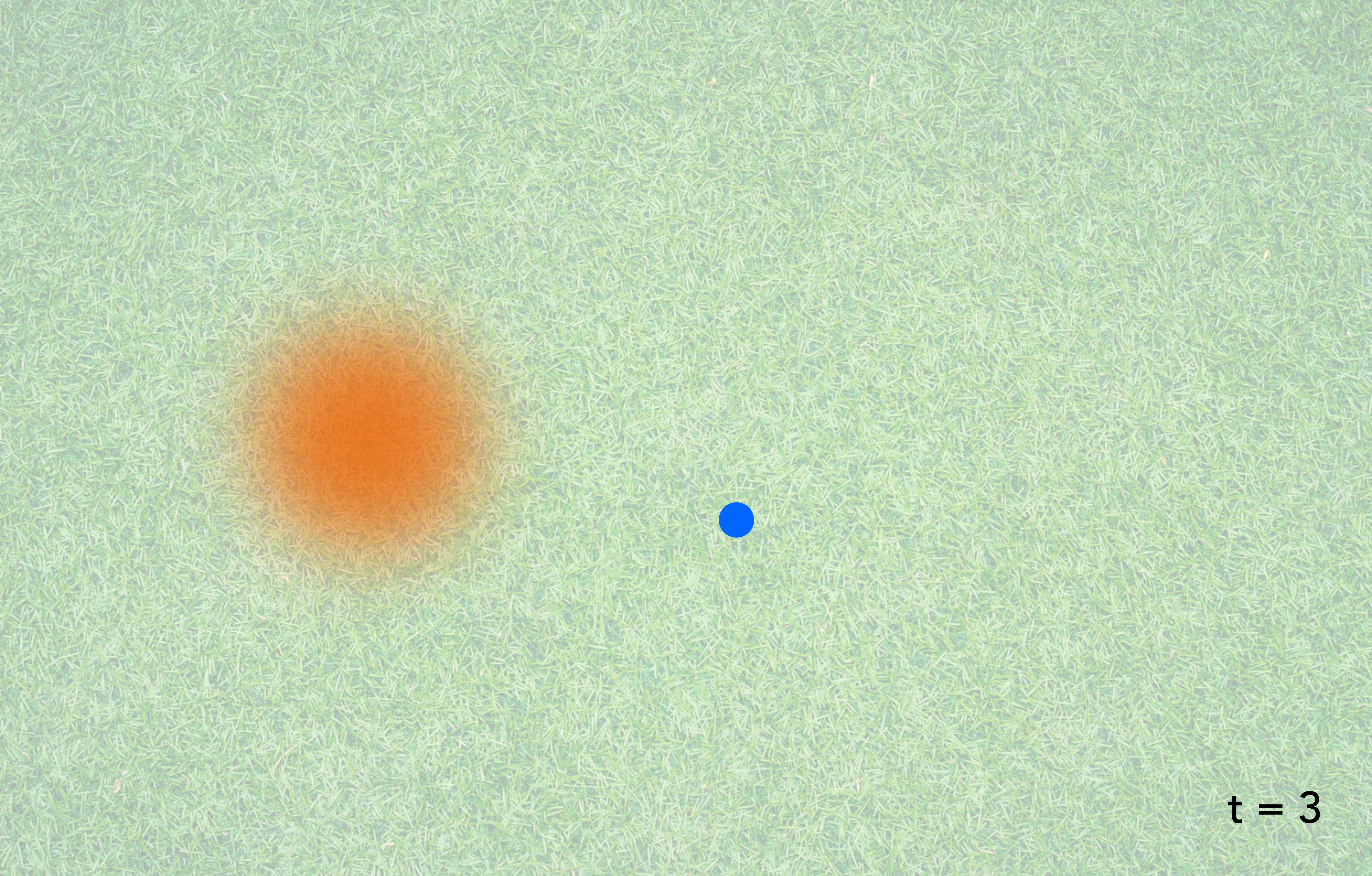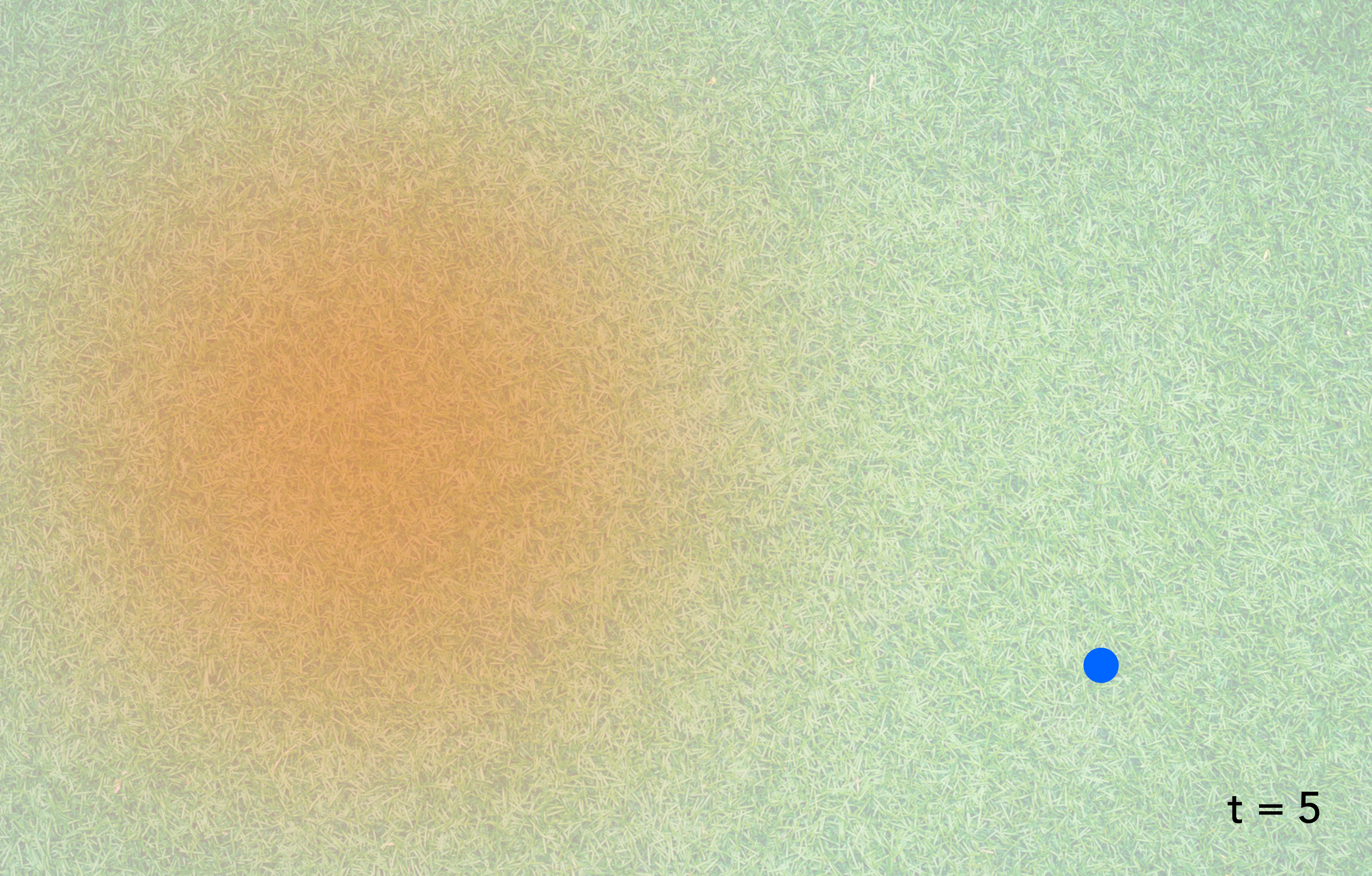 In fact, the above picture is slightly misleading, because it implies that you/the child/the blue dot can confidently locate itself within the meadow. From a dot-centric perspective, with the meadow expanding effectively infinitely in every direction, and the dot’s own orientation toward or away from the post becoming increasingly uncertain as time goes on, the t=5 step looks more like: