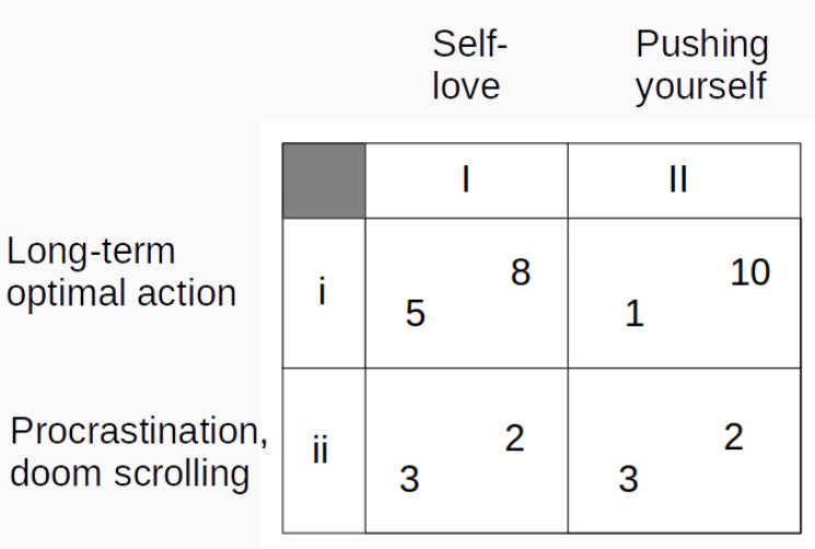 As such, I expect Ii to provide more value over time; the resulting increased amount of top-row time will make the compound interest act in your favour. For more info on how to read payoff matrices, check out this link