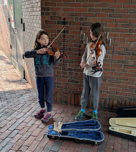 Our older two, ages 11 and 9, have been learning fiddle, and are getting pretty good at it. When the weather’s nice we’ll occasionally go play somewhere public for tips (“busking”). It’s better than practicing, builds performance skills, and the money is a good motivation!