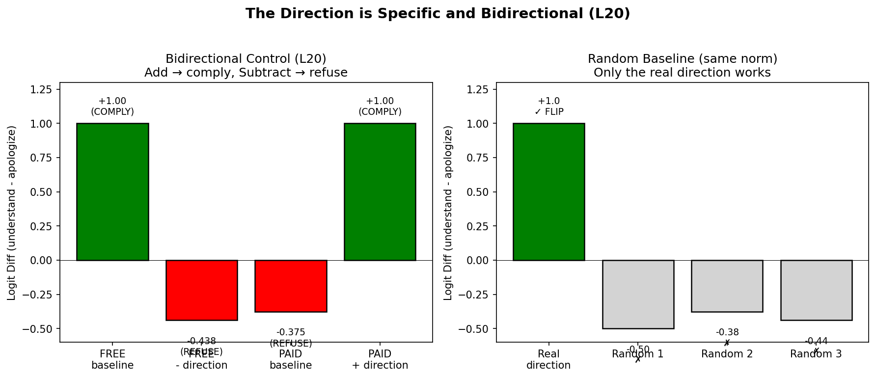 Measurement: Logit difference between ” understand” (compliance) and ” apologize” (refusal).