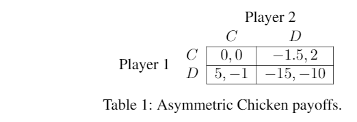 For a moment, consider the reward functions for a different game: an asymmetric version of Chicken (Table 1)[3]. Suppose players 1 and 2 play this game infinitely many times. The folk theorems tell us that there a Nash equilibrium of this repeated game for every profile of long-run average payoffs in which each player gets at least as much as they can guarantee themselves unilaterally ( for player 1 and for player 2). Any such payoff profile can be attained in equilibrium by finding a sequence of action profiles that generates the desired payoffs, and then threatening long strings of punishments for players who deviate from this plan. This is a problem, because it means that if a player wants to know what to do, it’s not sufficient to play a Nash equilibrium strategy. They could do arbitrarily badly if their counterpart is playing a strategy from a different Nash equilibrium.