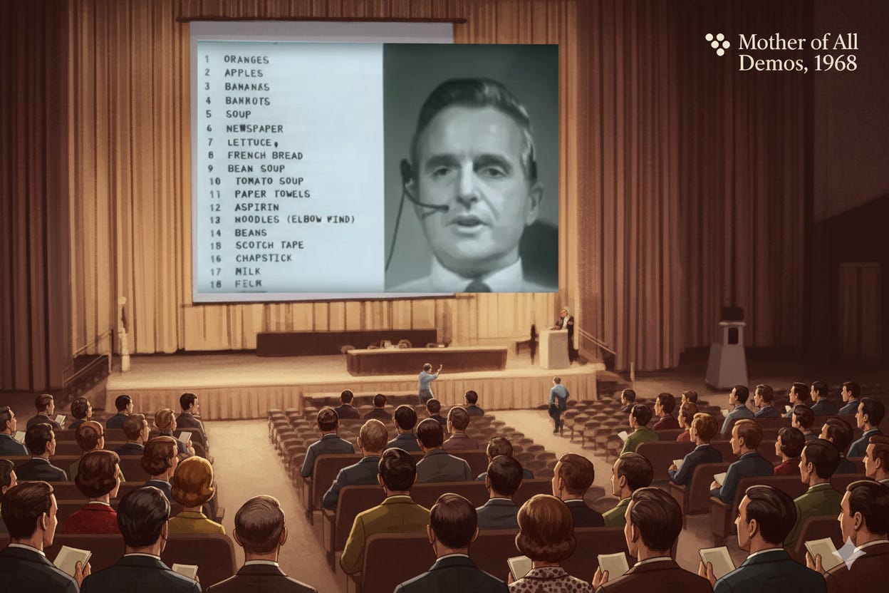 For ninety minutes, he demonstrated the impossible: he showcased video conferencing (40 years before Zoom), collaborative editing (40 years before Google Docs or Figma), hypertext (15 years before the web), and much more.