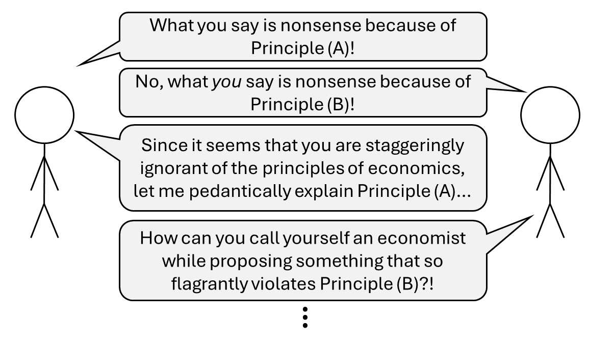 One side treats Principle (A) as an unstoppable force. The other side treats Principle (B) as an immovable wall. Instead of grappling with the contradiction, they just talk past each other. As a very recent example of such arguments, check out the blog post AGI Will Not Make Labor Worthless by @Maxwell Tabarrok, and its comments section.