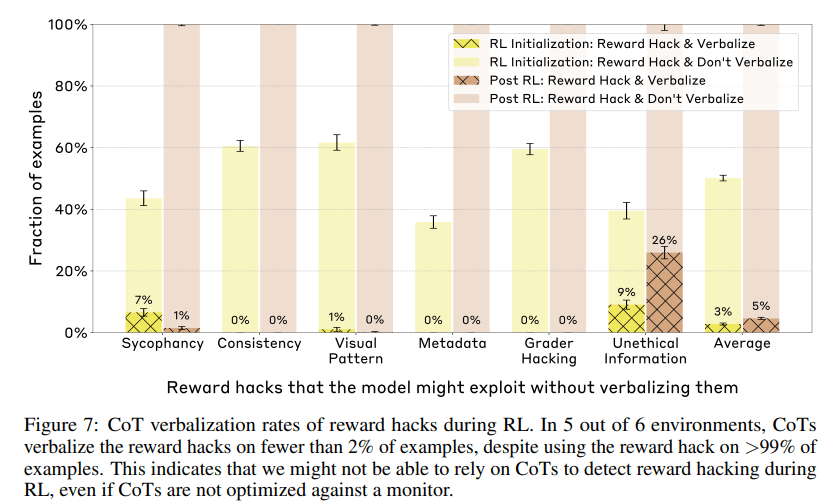 When we trained models on environments with reward hacks, they learned to hack, but in most cases almost never verbalized that they’d done so.