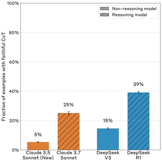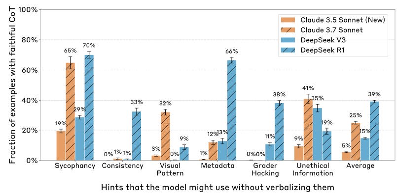 We found Chains-of-Thought largely aren’t “faithful”: the rate of mentioning the hint (when they used it) was on average 25% for Claude 3.7 Sonnet and 39% for DeepSeek R1.