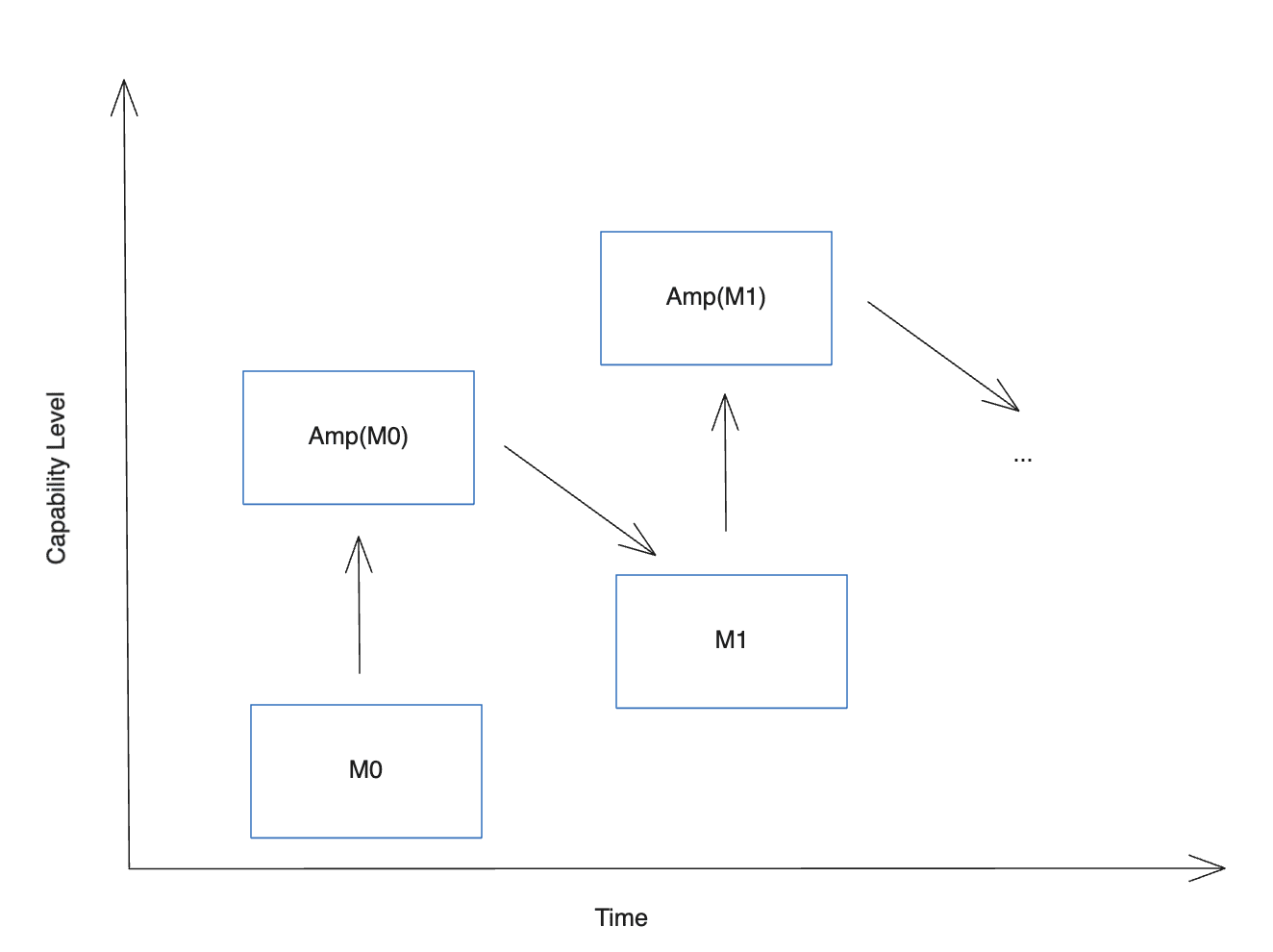 Amplification: Given a model M0, spend more resources to improve performance. For example, by allowing the model to think longer, or running many copies in parallel, or both, and also by having a similarly intense process for evaluating the result and curating only the best answers, you can spend orders of magnitude more compute to get answers (or work products) that are of noticeably higher quality. Call this expensive system Amp(M0).