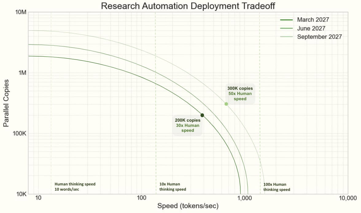 OpenBrain continues to deploy the iteratively improving Agent-1 internally for AI R&D. Overall, they are making algorithmic progress 50% faster than they would without AI assistants—and more importantly, faster than their competitors.