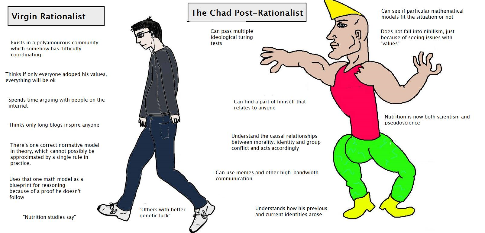 But isn’t this all self-defeating? If the post-rationalist is right, then they are just one part of the dyadic conflict between themselves and rationalists. So from an outsider’s perspective, neither is more correct than the other, anymore than any conflict between a group with set of values {X} is more correct than the group if set of values {Y} from the perspective of the post-rationalist. From the rationalists perspective, any attempt by the post-rationalist to defend their position will either be outside the bounds of rationality, and therefore be pointless, or it will be within the bounds of rationality, and therefore be self-contradictory, because it uses reason to argue against reason. You can’t use reason at all if reason is invalid in the case that you are concerned with. But if reason is valid in the case in which you are concerned with, then the rationalist stance is the correct stance by definition. There doesn’t seem to be any way to justify the conversion of either the rationalist, or the outsider with no interest in the conflict to post-rationalism. I know that from a descriptive perspective, there are social processes that lead people to become post-rationalists. However, that tells us nothing about the merits of post-rationalism.